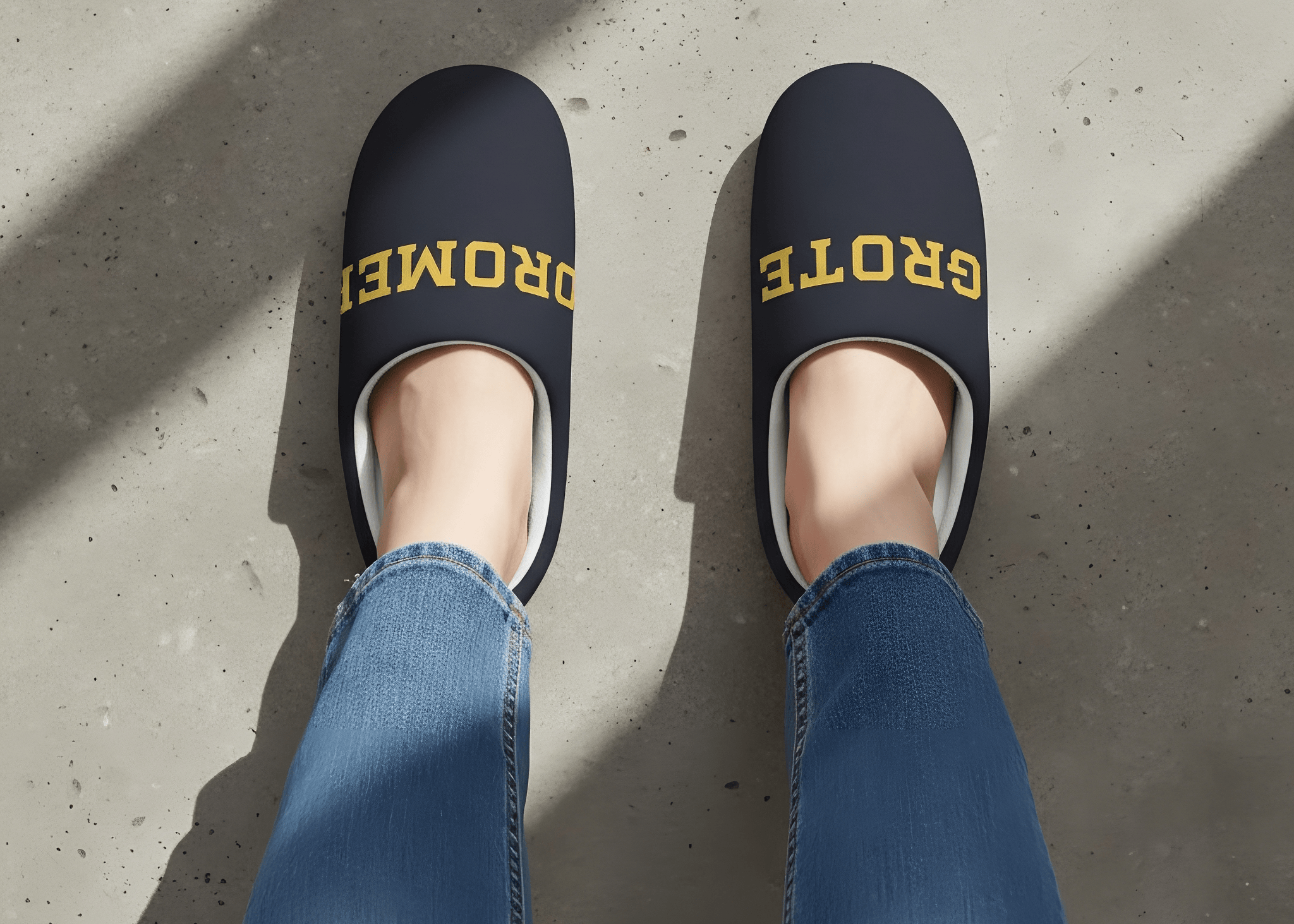 breidden we de collectie uit met Immer Müde (Altijd Moe), Ade Merci (Doei, Bedankt) en nieuwe varianten van Hüt Nöd (Vandaag Niet). Meer tekst, meer attitude, dezelfde compromisloze comfort. De slippers werden een taal die je thuis draagt.